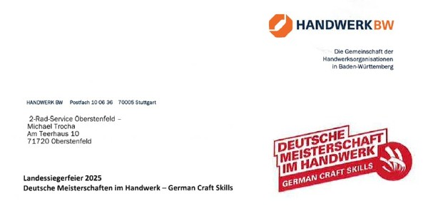 Am Freitag, den 24.10.2025, bleibt unser Betrieb am Nachmittag geschlossen, da in Stuttgart die Siegerehrung der Kammersieger stattfindet.